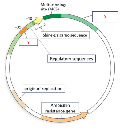 Penjelasan: Bagian Y terletak di hulu (upstream) dari Ribosome Binding Site (RBS) dan MCS. Ini adalah posisi Promotor. Fungsi utama promotor adalah sebagai situs pengikatan (binding site) bagi enzim RNA Polimerase untuk memulai inisiasi transkripsi.